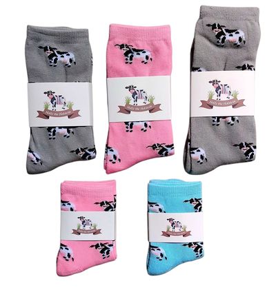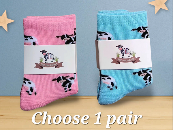 The 'Calf Pack' includes a personalised copy of 'Holly the Holstein' with either a pair of Blue OR Pink Child 'Holly' socks.